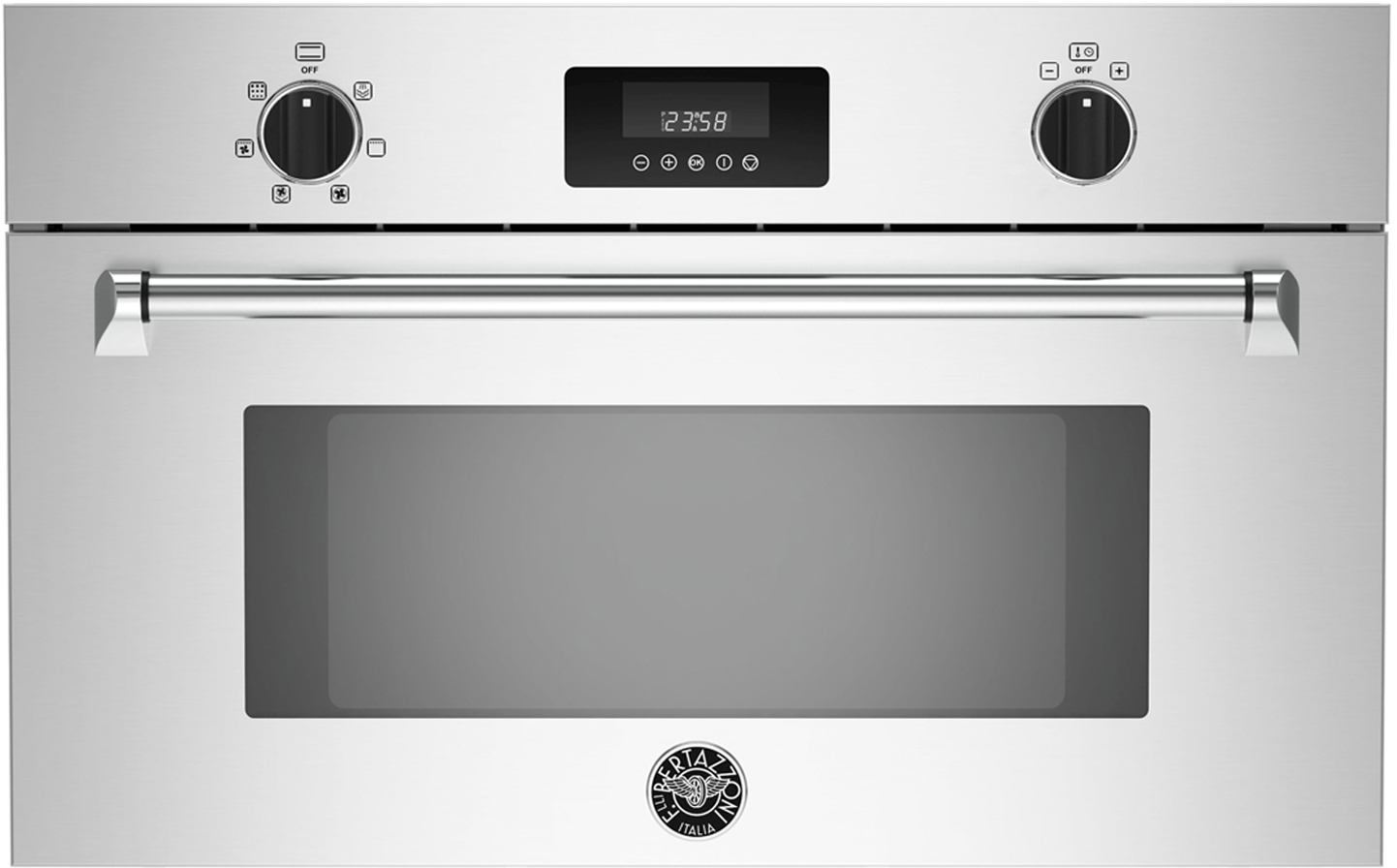 Bertazzoni ovens are superb cooking appliances designed, engineered and made in Italy. All Bertazzoni appliances integrate seamlessly into style-harmonized suites for a true, high-performing kitchen. The convection steam oven combines convection baking, electric grilling and steam in one versatile unit. Using water-generated steam in the cooking cycle in addition to convection helps maintain balanced moisture in the food while sealing-in flavors and vitamins. With its intuitive controls and family-sized capacity, the Bertazzoni convection steam oven delivers the healthiest and most flavorful cooking results. All Bertazzoni appliances are covered by a 2-year warranty. Products and packaging are 99% recyclable.