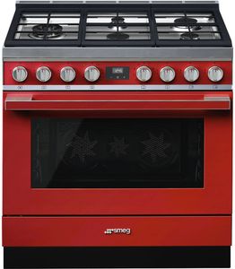 Smeg 36” Red Portofino Pro-Style Dual Fuel Range with 4.5 cu. ft. total capacity, 5 gas burners and vapor clean functionRead More