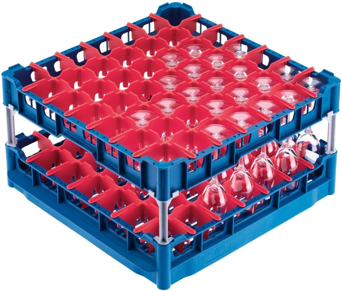 Basket with high top frame for the optimum loading of 49 glasses up to 9 inches tall.