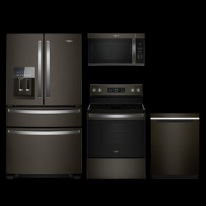 Whirlpool® 4 Piece Black Stainless Steel Kitchen Package with a French door refrigerator, electric range, built-in dishwasher and over the range microwave.Read More