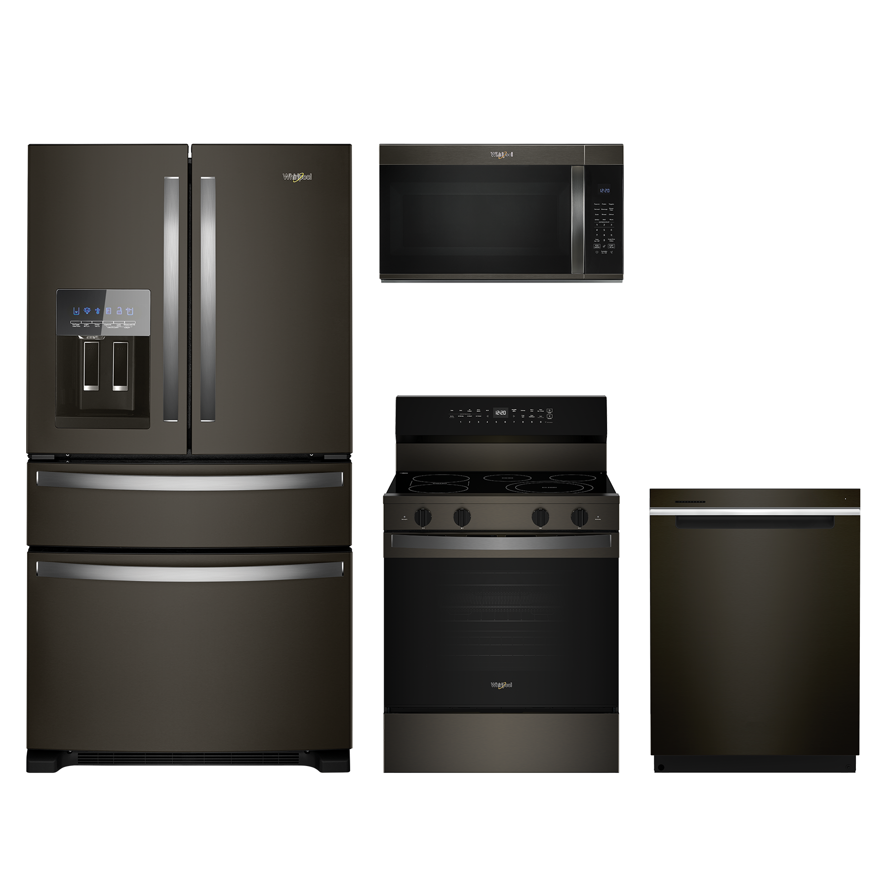 Whirlpool® 4 Piece Black Stainless Steel Kitchen Package with a French door refrigerator, electric range, built-in dishwasher and over the range microwave.Read More